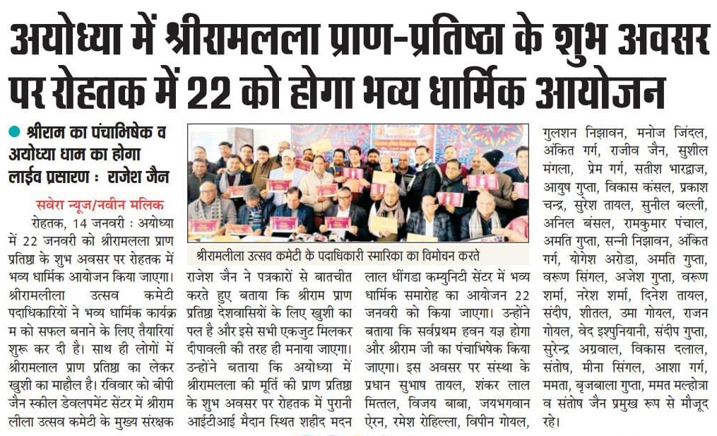 Grand Religious Event to Be Held in Rohtak on 22nd to Mark the Auspicious Occasion of Shri Ramlalla Pran-Pratishtha in Ayodhya