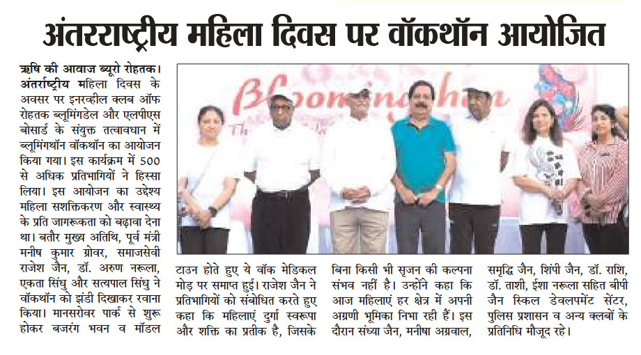 On International Women’s Day, the Inner Wheel Club of Rohtak Blooming Dale and LPS Bossard organized the “Bloomingthon Walkathon” at Subhash Chowk.