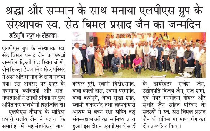 The 95th birth anniversary of LPS Group founder Late Seth Bimal Prasad Jain was observed with respect and honor at the B.P. Jain Skill Development Center campus on Delhi Road.